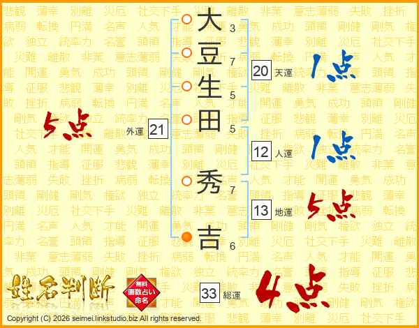 大豆生田秀吉さんの総運は33画の4点!