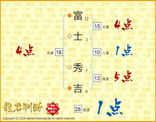 あなたの人生を表す1番重要な運勢です。生涯を通じて影響する総合運となり、主に50歳以降の晩年期に影響を及ぼします。苗字と名前の合計画数。