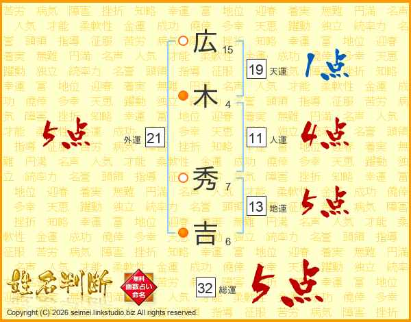 広木秀吉さんの総運は32画の5点!