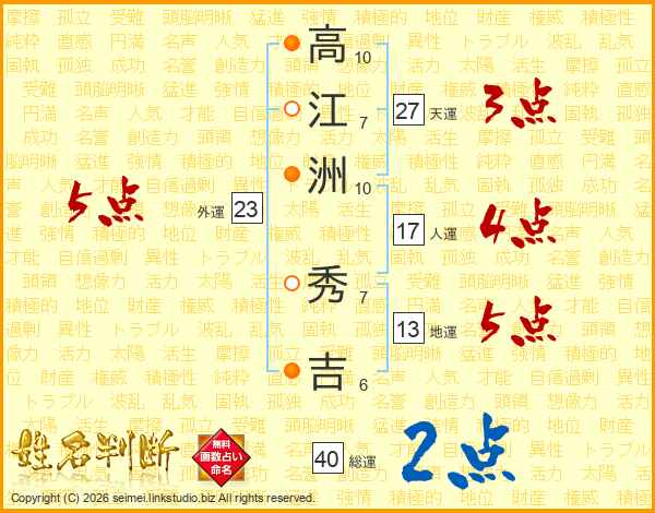 高(10画)江(7画)洲(10画) 秀(7画)吉(6画)