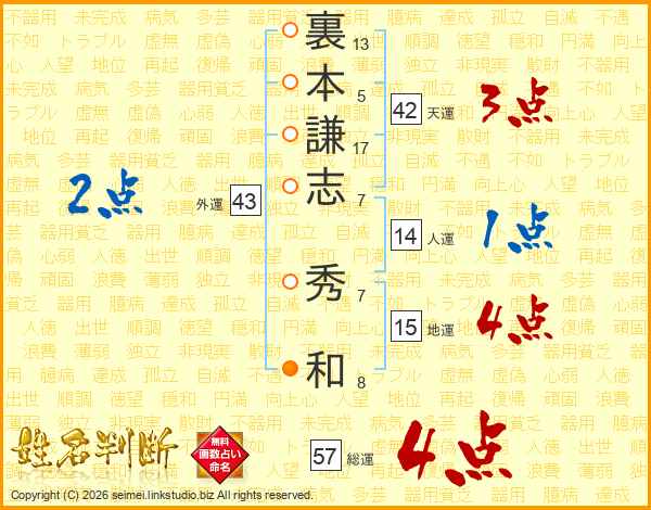 裏本謙志秀和さんの総運は57画の4点!