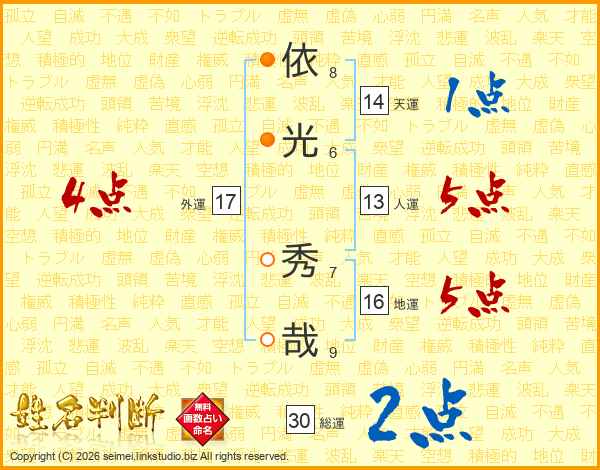 生活面を象徴する運勢です。外部から受ける影響力を表し、結婚運、家庭運や職場、環境への順応性を表します。総運から人運を引いた画数。姓や名が1文字の場合を除く。
