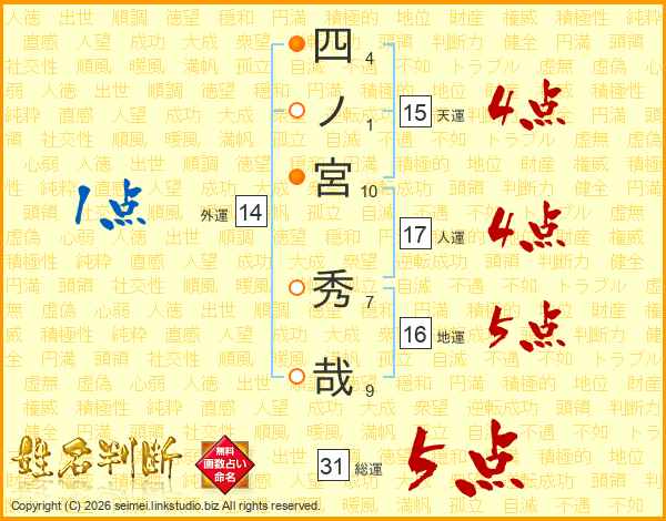 四(4画)ノ(1画)宮(10画) 秀(7画)哉(9画)