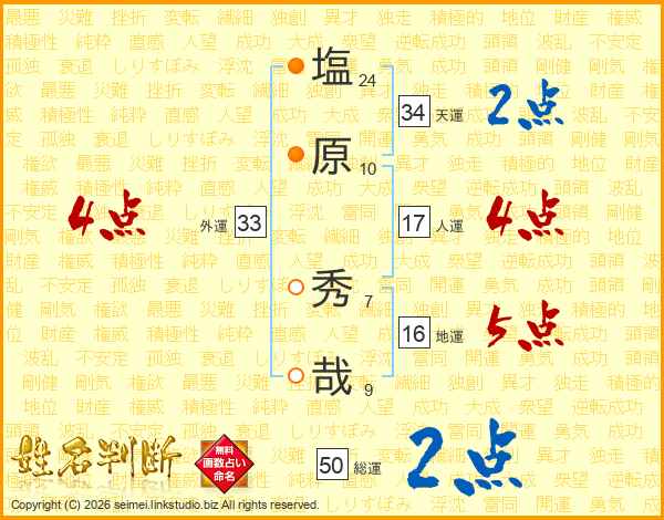 塩(24画)原(10画) 秀(7画)哉(9画)
