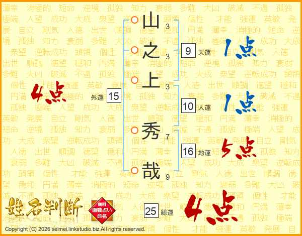 山(3画)之(3画)上(3画) 秀(7画)哉(9画)