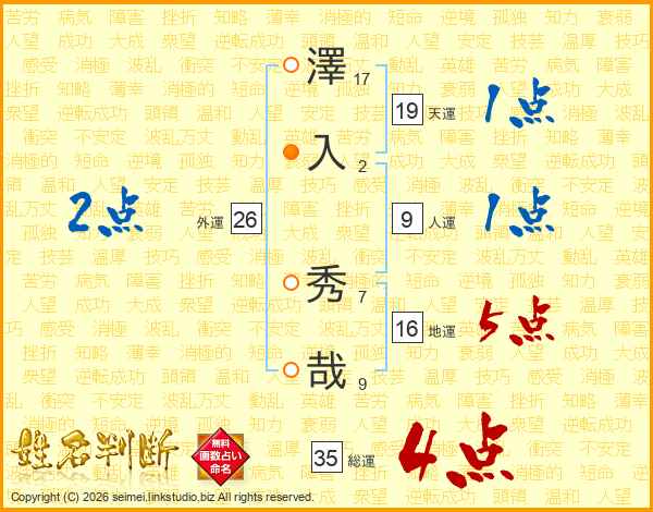 澤入秀哉さんの総運は35画の4点!