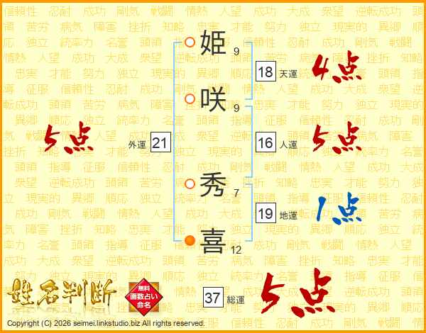 姫咲秀喜さんの総運は37画の5点!