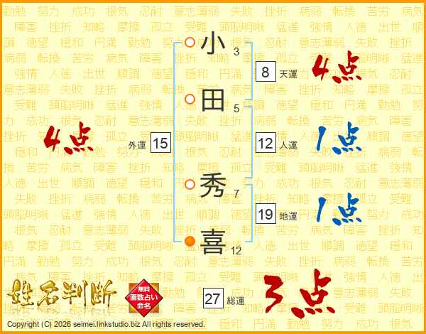 小(3画)田(5画) 秀(7画)喜(12画)