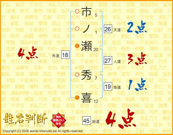 市(5画)ノ(1画)瀬(20画) 秀(7画)喜(12画)