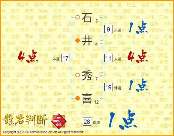 画数の奇数(○陽)と偶数(●陰)の配列で吉凶を占います。どちらかにかたよる名前は大凶名で避ける必要があります。画数の奇数偶数。