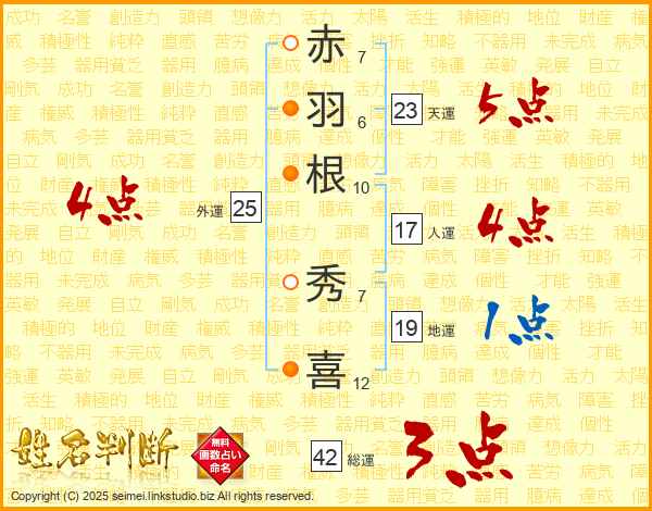 赤(7画)羽(6画)根(10画) 秀(7画)喜(12画)