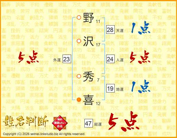 野沢秀喜さんの総運は47画の5点!