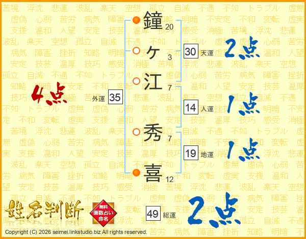 鐘(20画)ヶ(3画)江(7画) 秀(7画)喜(12画)