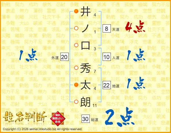 井(4画)ノ(1画)口(3画) 秀(7画)太(4画)朗(11画)