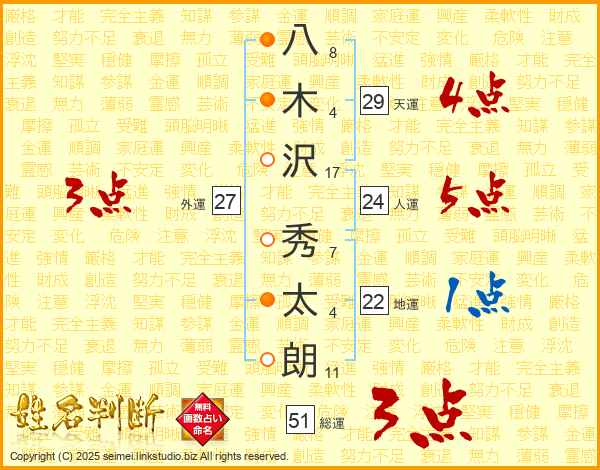 八(8画)木(4画)沢(17画) 秀(7画)太(4画)朗(11画)