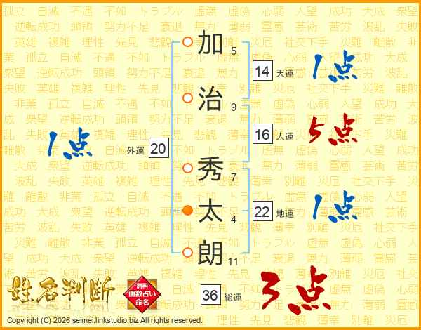 加(5画)治(9画) 秀(7画)太(4画)朗(11画)