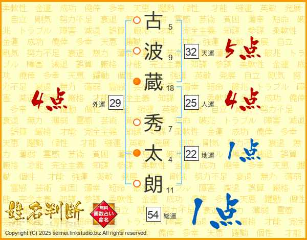 古(5画)波(9画)蔵(18画) 秀(7画)太(4画)朗(11画)