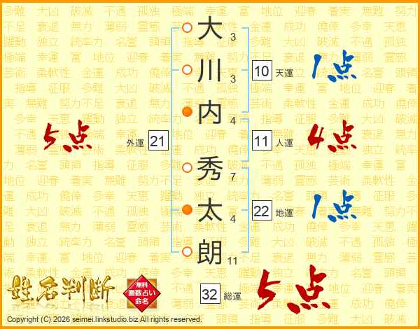 大(3画)川(3画)内(4画) 秀(7画)太(4画)朗(11画)