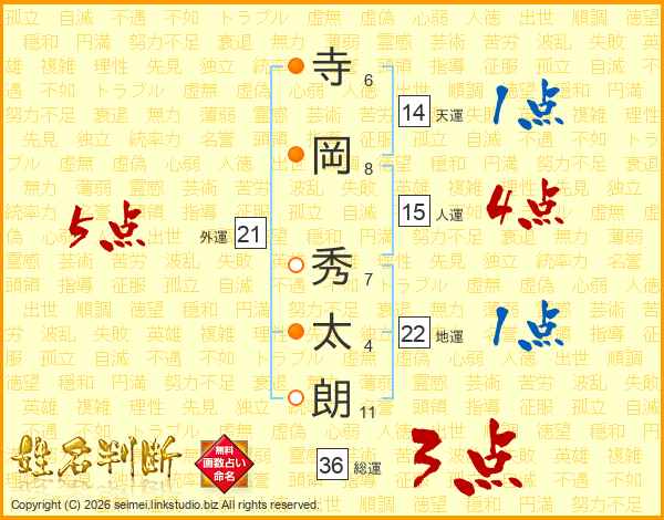 寺(6画)岡(8画) 秀(7画)太(4画)朗(11画)