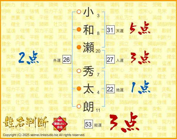 小(3画)和(8画)瀬(20画) 秀(7画)太(4画)朗(11画)