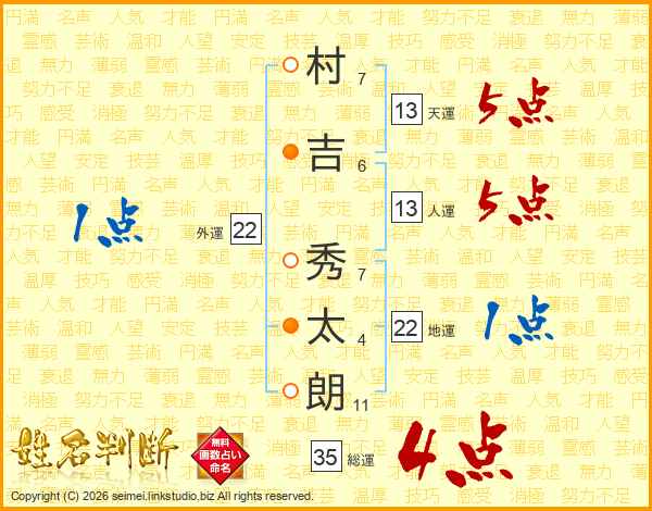 村(7画)吉(6画) 秀(7画)太(4画)朗(11画)