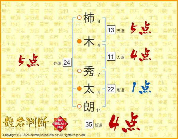 柿(9画)木(4画) 秀(7画)太(4画)朗(11画)
