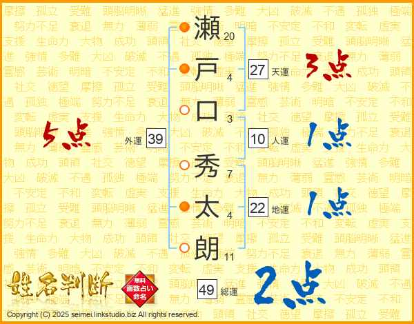 瀬(20画)戸(4画)口(3画) 秀(7画)太(4画)朗(11画)