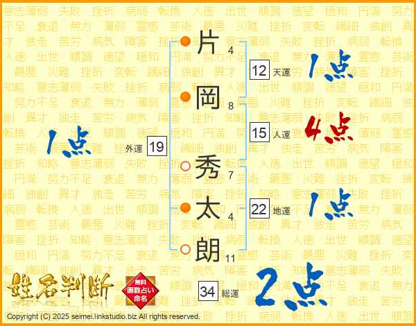片(4画)岡(8画) 秀(7画)太(4画)朗(11画)