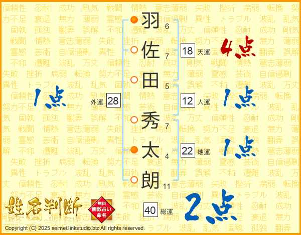 羽(6画)佐(7画)田(5画) 秀(7画)太(4画)朗(11画)