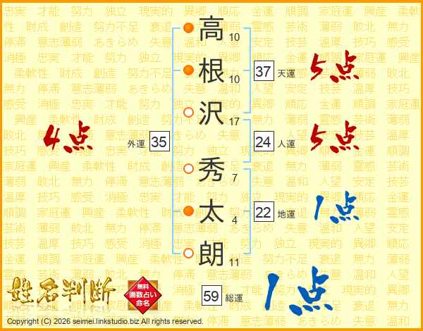 高(10画)根(10画)沢(17画) 秀(7画)太(4画)朗(11画)