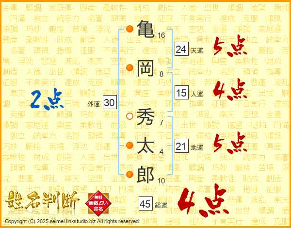 亀(16画)岡(8画) 秀(7画)太(4画)郎(10画)
