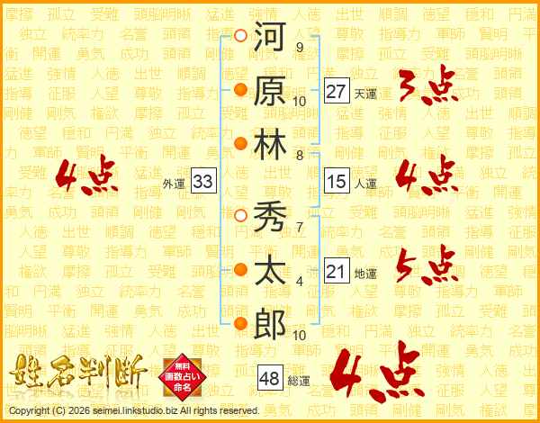 河(9画)原(10画)林(8画) 秀(7画)太(4画)郎(10画)