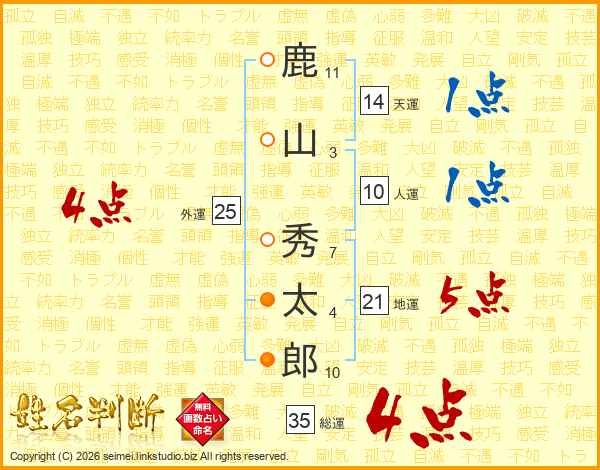 鹿(11画)山(3画) 秀(7画)太(4画)郎(10画)