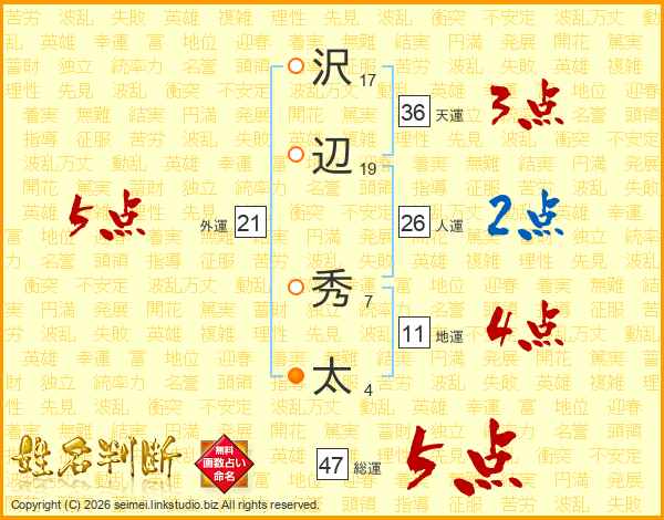 沢(17画)辺(19画) 秀(7画)太(4画)