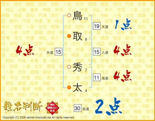 鳥(11画)取(8画) 秀(7画)太(4画)