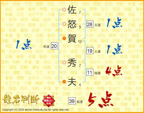 佐怒賀秀夫さんの総運は39画の5点!