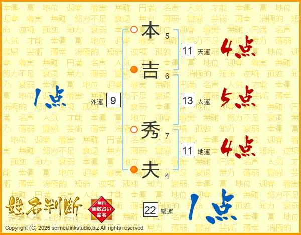 本(5画)吉(6画) 秀(7画)夫(4画)