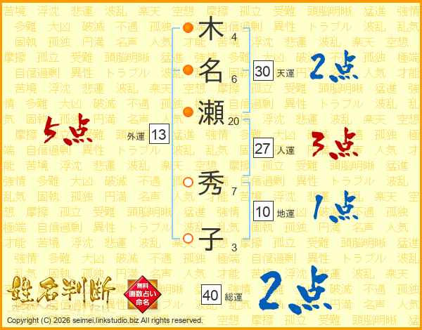 木(4画)名(6画)瀬(20画) 秀(7画)子(3画)