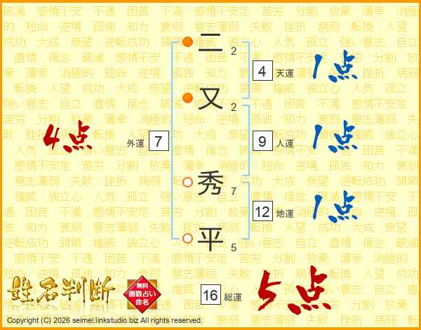 二又秀平さんの総運は16画の5点!