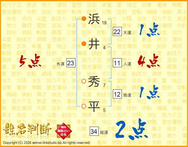 浜(18画)井(4画) 秀(7画)平(5画)