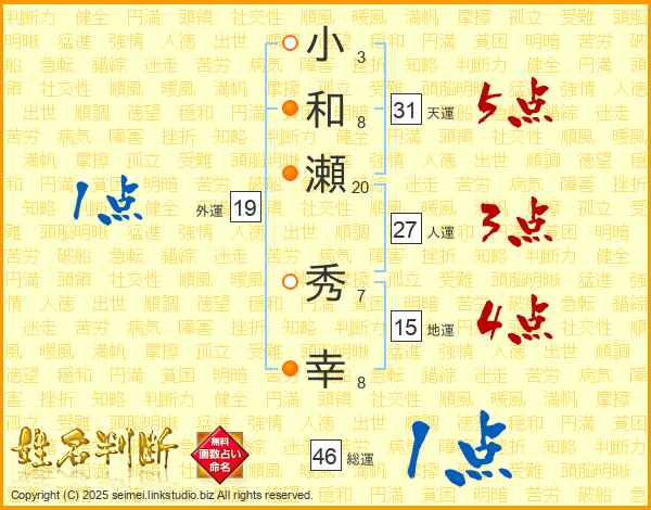 小(3画)和(8画)瀬(20画) 秀(7画)幸(8画)