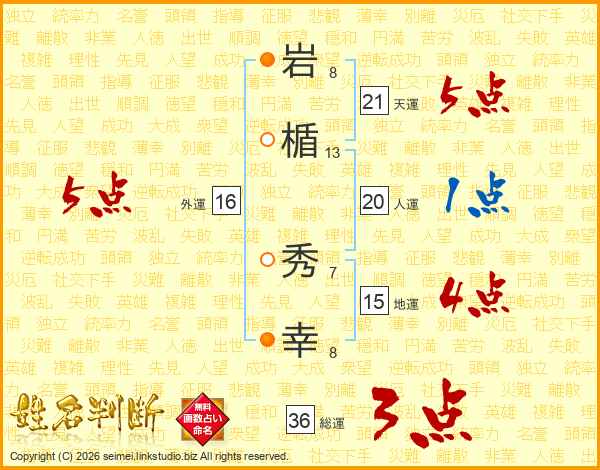 岩(8画)楯(13画) 秀(7画)幸(8画)