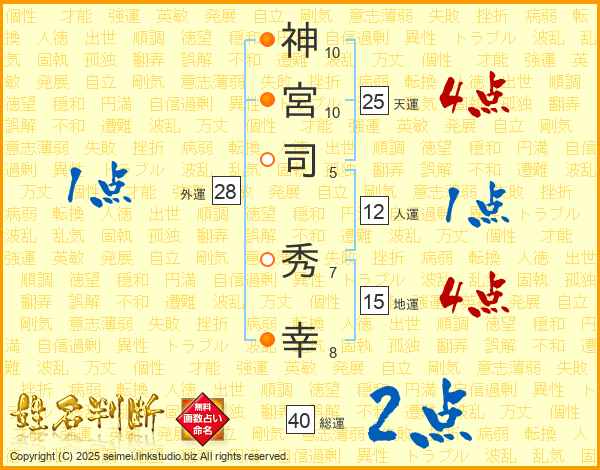 神(10画)宮(10画)司(5画) 秀(7画)幸(8画)