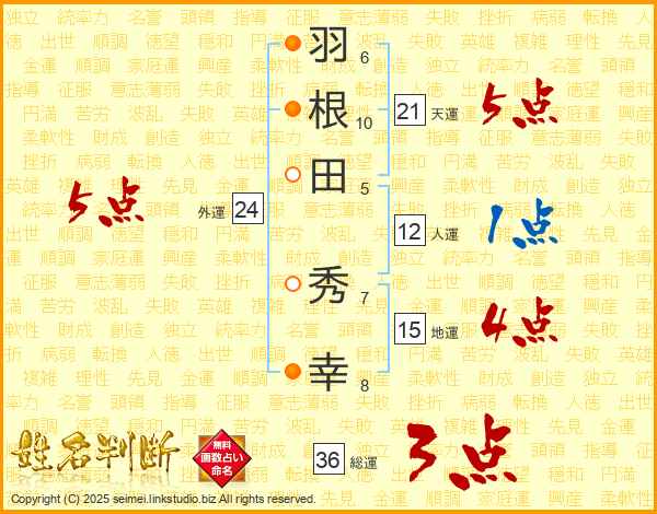 羽根田秀幸さんの天運は21画の5点!