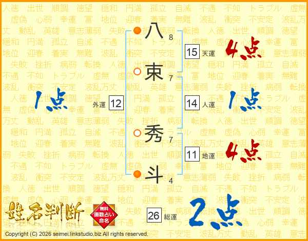 生活面を象徴する運勢です。外部から受ける影響力を表し、結婚運、家庭運や職場、環境への順応性を表します。総運から人運を引いた画数。姓や名が1文字の場合を除く。