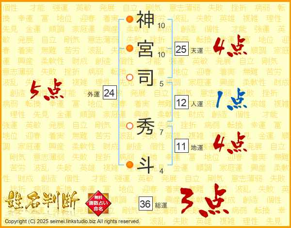 神(10画)宮(10画)司(5画) 秀(7画)斗(4画)