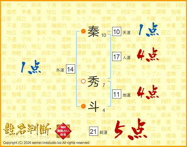 生活面を象徴する運勢です。外部から受ける影響力を表し、結婚運、家庭運や職場、環境への順応性を表します。総運から人運を引いた画数。姓や名が1文字の場合を除く。