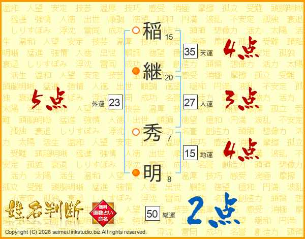 稲(15画)継(20画) 秀(7画)明(8画)