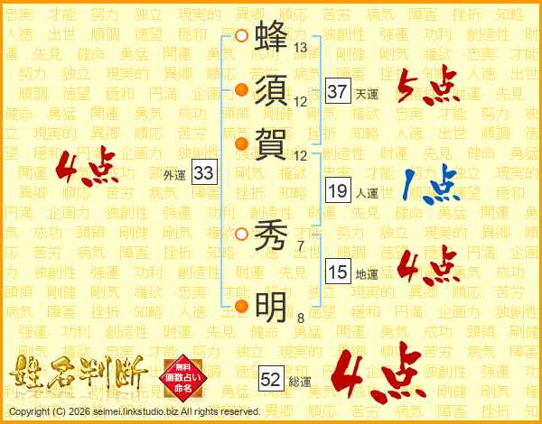蜂須賀秀明さんの総運は52画の4点!