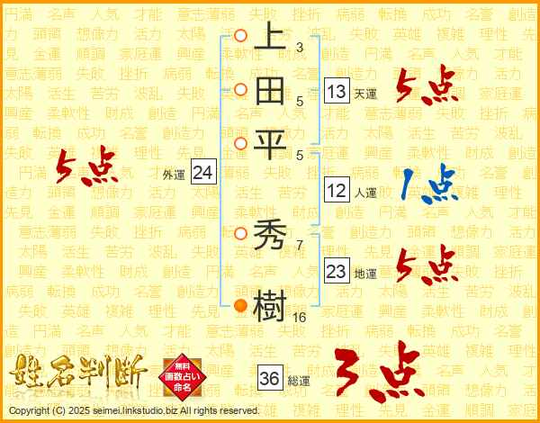 上(3画)田(5画)平(5画) 秀(7画)樹(16画)